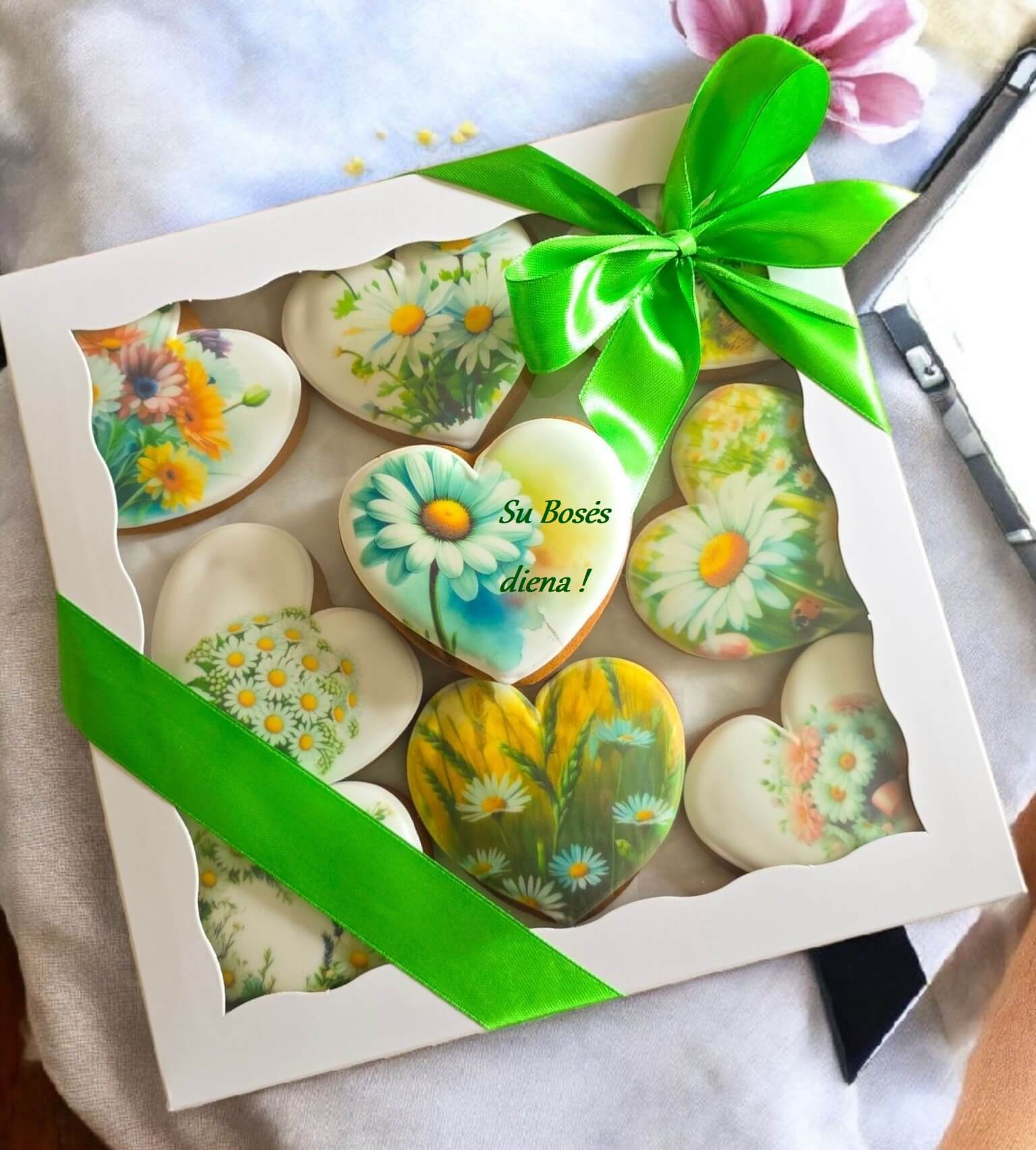 Sveikinimo meduoliai dėžutėje skaidriu viršeliu. Dėžutės matmenys 21x 21 cm.
