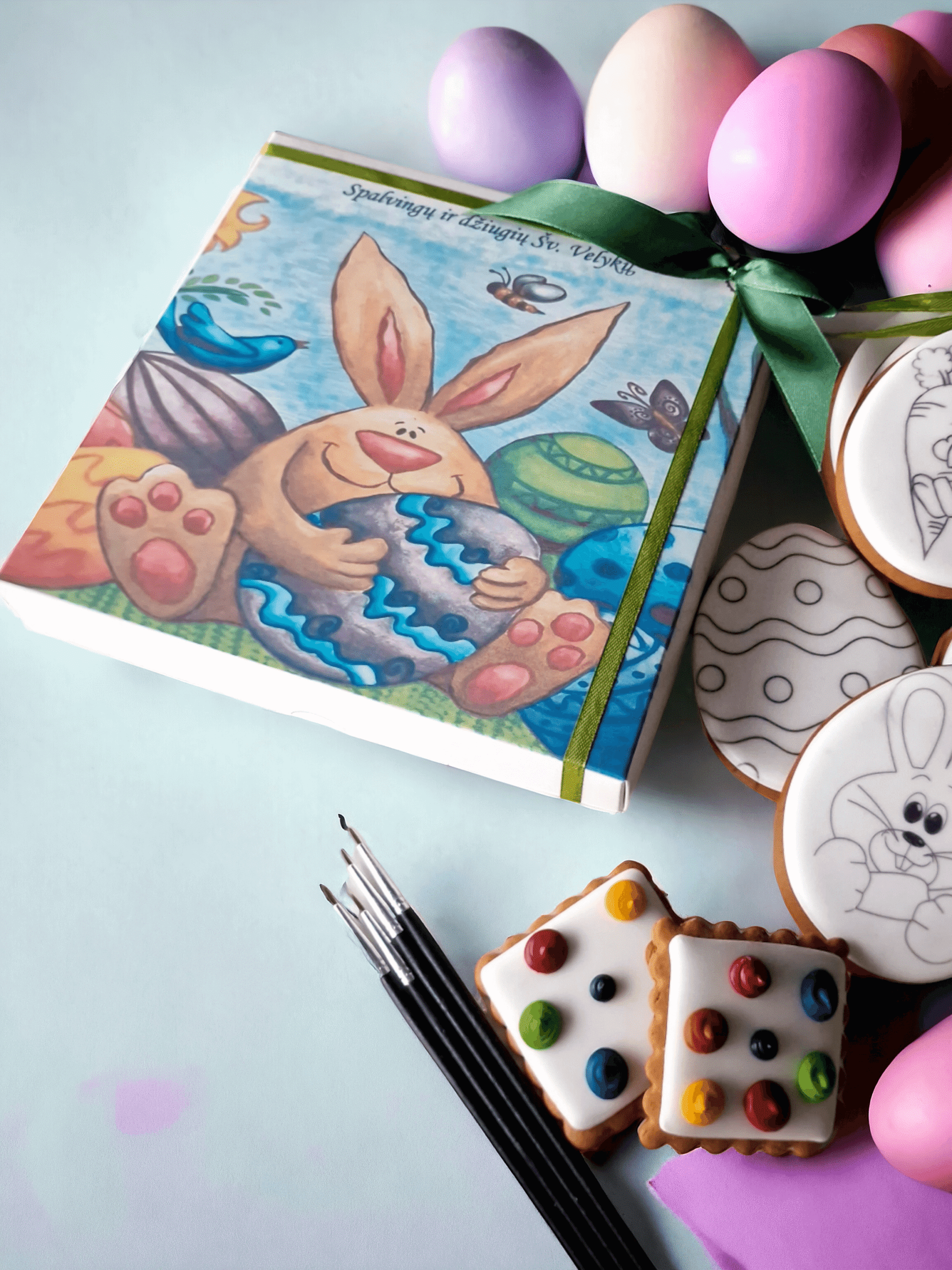 Velykų spalvomis išmargintoje dėžutėje – meduoliai, skirti nuspalvinti.