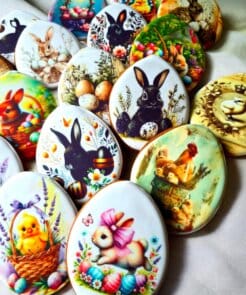 Rankų darbo velykinis meduolis kiaušinio formos, dekoruotas vienu iš įvairių pavasariškų dizainų. Zuikučiai, viščiukai, margučiai ar vintažiniai motyvai – dizainas parenkamas atsitiktine tvarka.