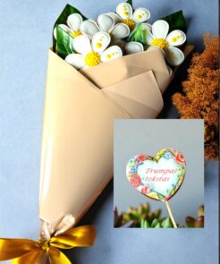 „Su Mamytės diena!“ – tai rankų darbo meduolių puokštė, sudaryta iš 5 ramunių formos meduolių ir vienos širdelės su užrašu. Balti žiedai su švelniais geltonais akcentais sukuria natūralumo, švaros ir lengvumo jausmą.