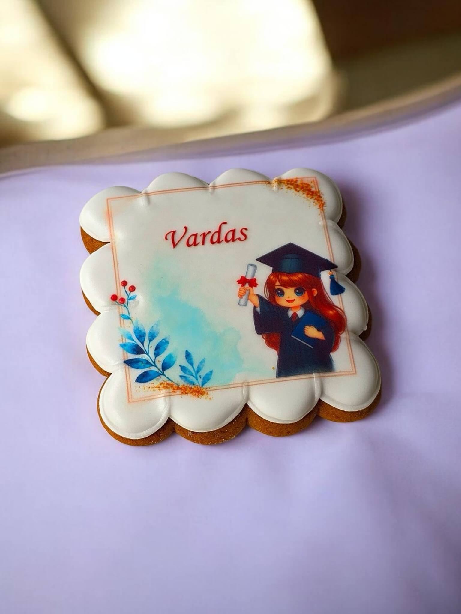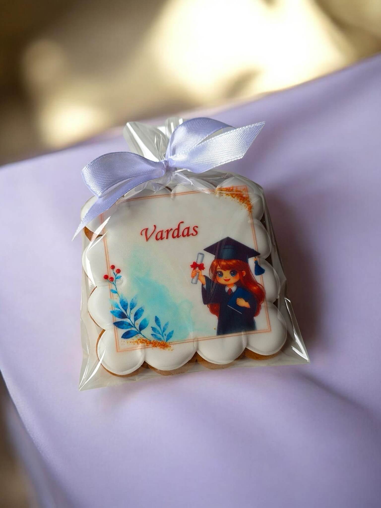Šis ~8×8 cm meduolis – asmeniška ir išskirtinė dovana vaikui ypatingai progai. Papuoštas miela iliustracija su diplomą laikančia mažąja absolvente ir papildytas vaiko vardu, jis tampa ne tik skaniu desertu, bet ir simboliniu įvertinimu už nueitą kelią.