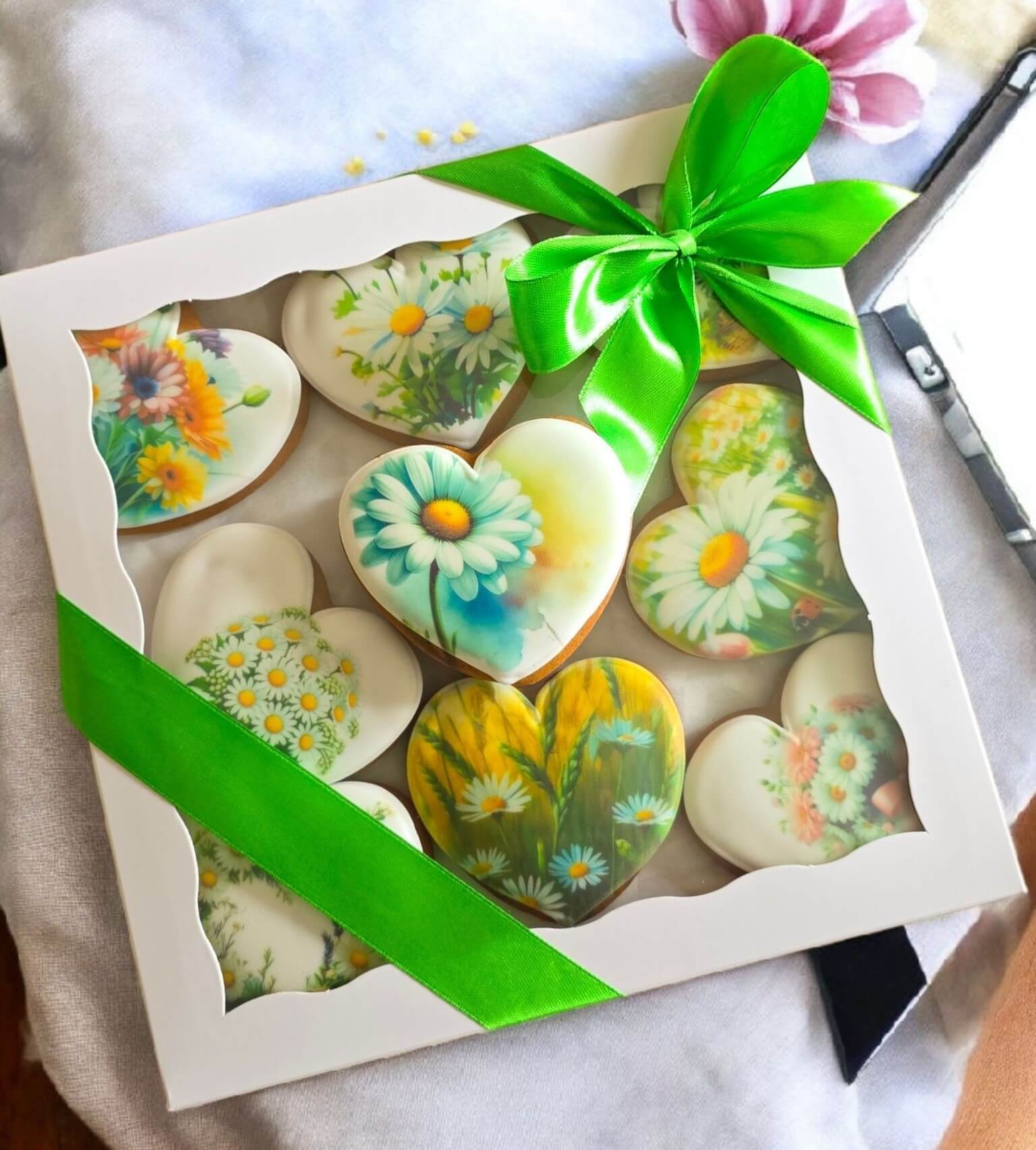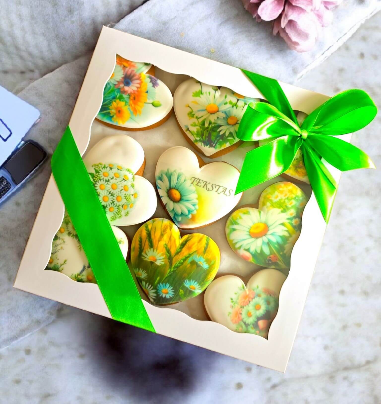Dėžutėje 9 vnt. meduolių, dėžutės matmenys 21×21 cm.