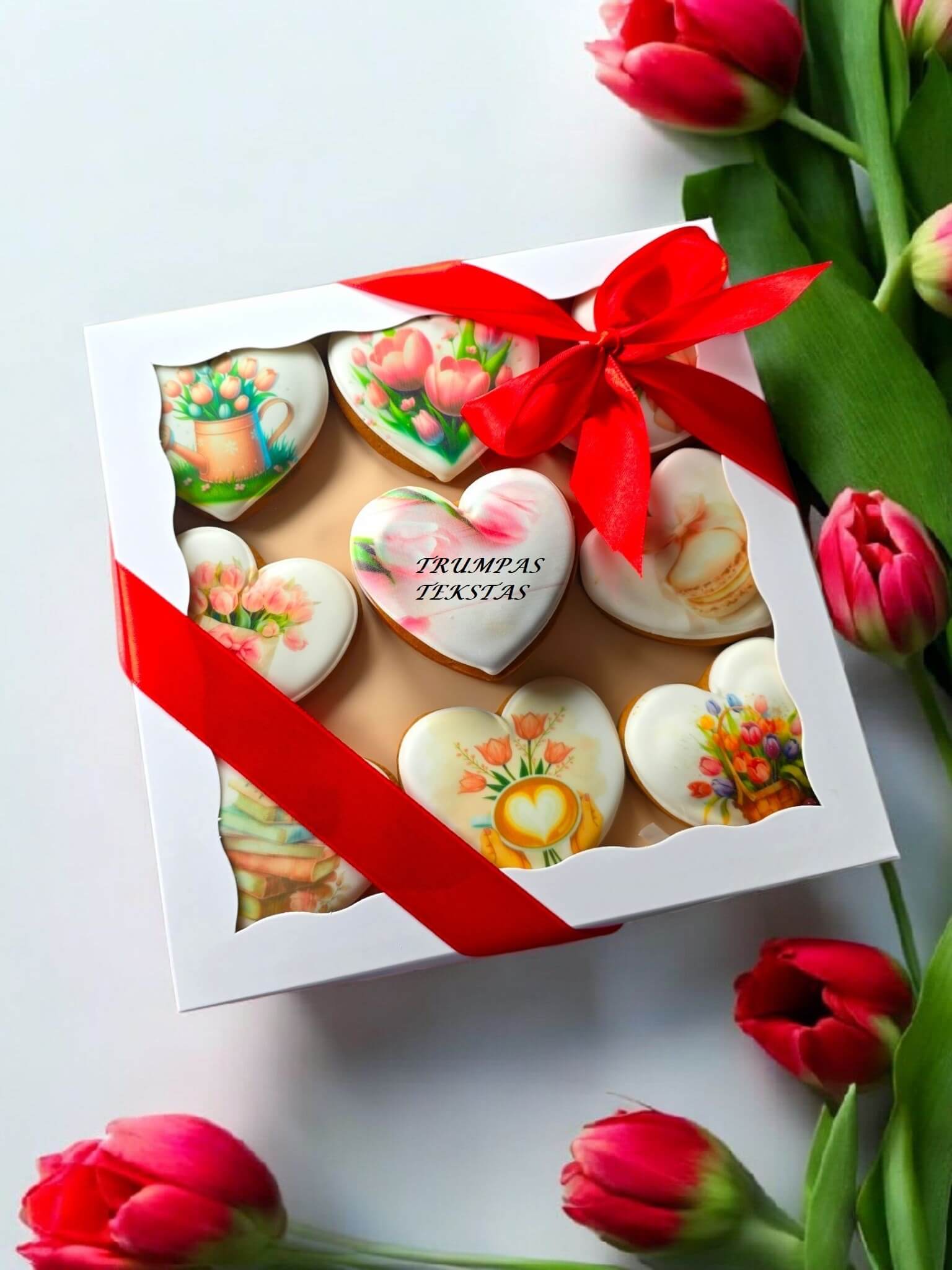 Dėžutėje 9 vnt. meduolių, dėžutės matmenys 21×21 cm.