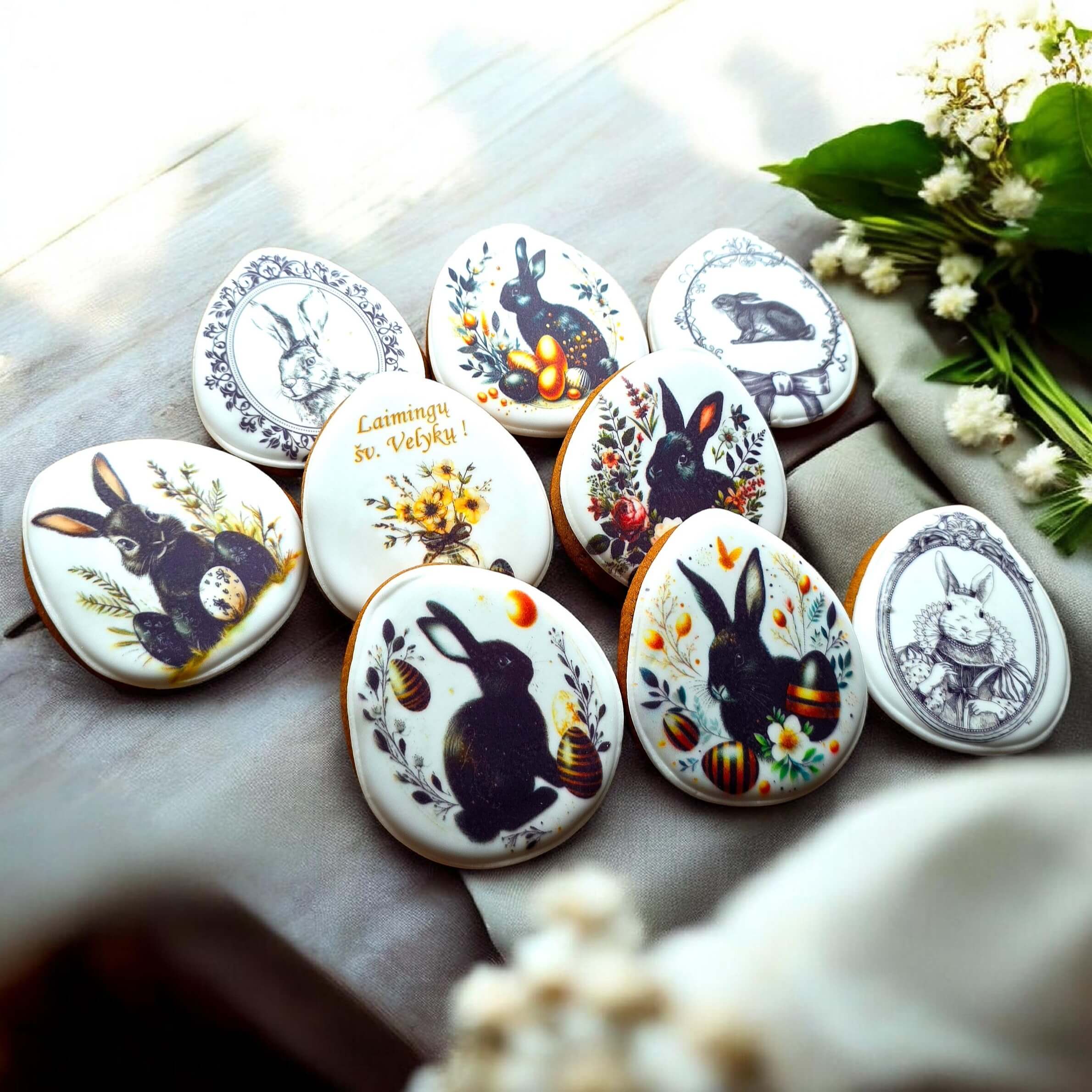 Elegantiško, kontrastingo stiliaus velykinių meduolių rinkinys, sukurtas ieškantiems išskirtinio šventinio akcento. Iliustracijose dominuoja klasikiniai juodų zuikučių, grafiški augaliniai ornamentai ir subtilūs pavasario motyvai, suteikiantys rinkiniui prabangos ir modernios estetikos pojūtį.