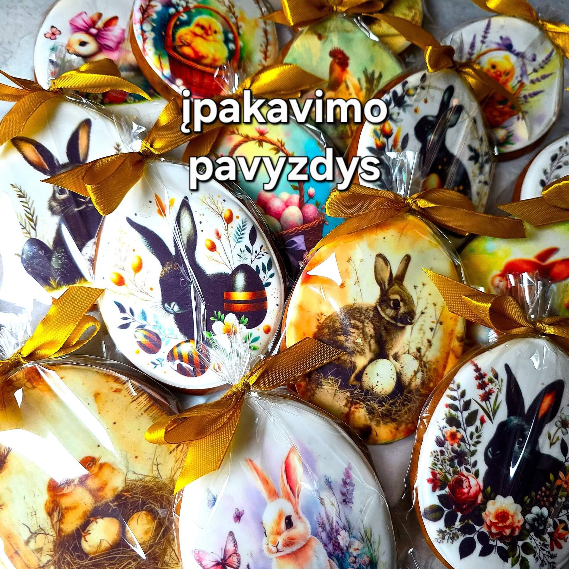 Kiekvienas meduolis supakuotas individualiai į skaidrų maišelį ir perrištas kaspinėliu – paruoštas įteikti kaip nedidelė Velykų dovana.