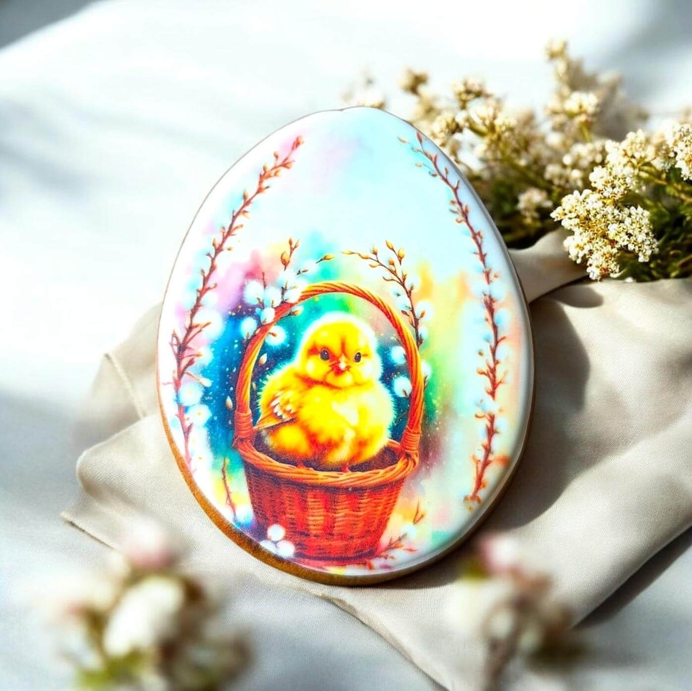 Šis kiaušinio formos velykinis meduolis dekoruotas šilta ir spalvinga pavasario iliustracija – mažas viščiukas jaukiai įsitaisęs krepšelyje, apsuptas švelnių šviesos ir pavasario detalių.