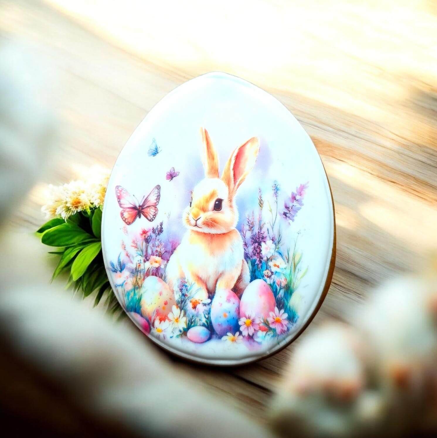 Šis kiaušinio formos velykinis meduolis dekoruotas lengva, akvarelinio stiliaus iliustracija – zuikutis tarp pavasario gėlių, margučių ir subtilių drugelių. Pasteliniai atspalviai, švelnios spalvos ir daug šviesos sukuria estetišką, harmoningą šventės įspūdį.