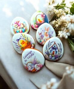 Švelnus, pavasariškas Velykų meduolių rinkinys, sukurtas jaukiai ir džiugiai šventei. Pastelinių spalvų iliustracijos su zuikučiais, viščiukais ir margučiais kuria lengvą, šviesią Velykų nuotaiką. Kiekvienas meduolis dekoruotas kruopščiai ir individualiai.