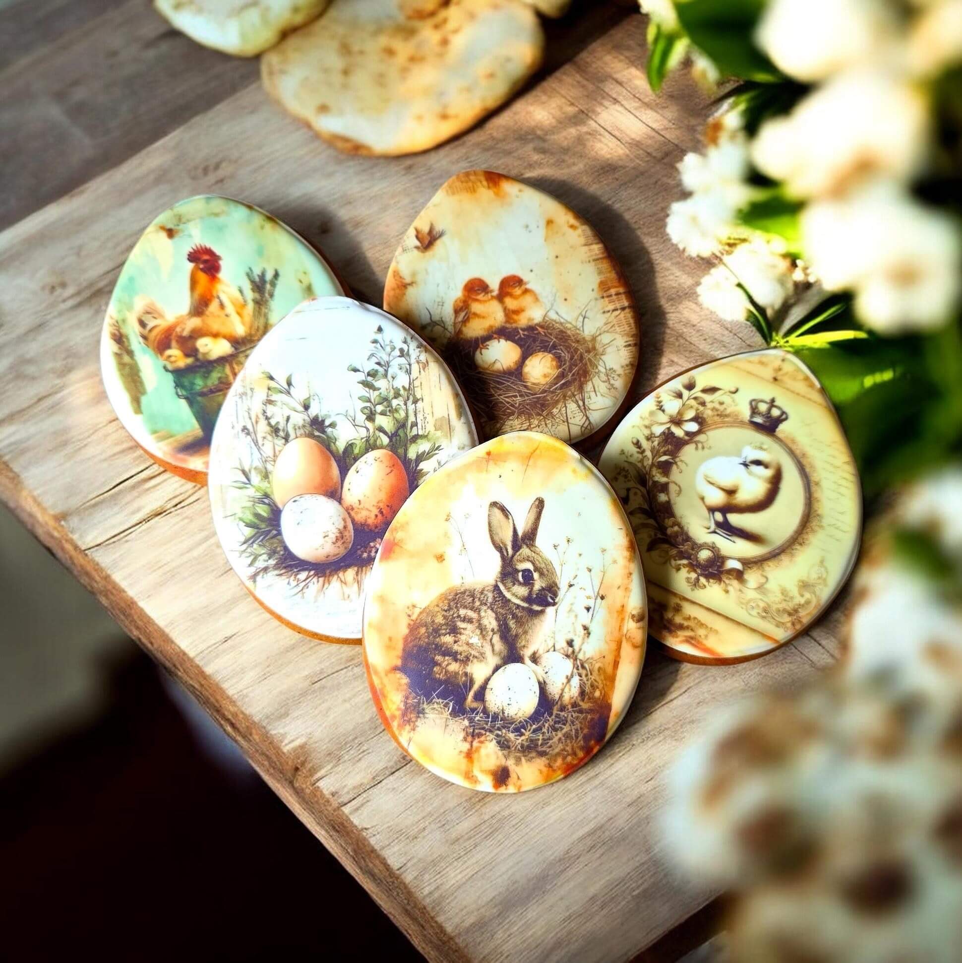 5 vnt. rankų darbo velykinių meduolių rinkinys, dekoruotas vintažinio stiliaus iliustracijomis. Šiltų, sendinto popieriaus atspalvių dizainas primena senovinius atvirukus ir kuria elegantišką, jaukią Velykų nuotaiką.