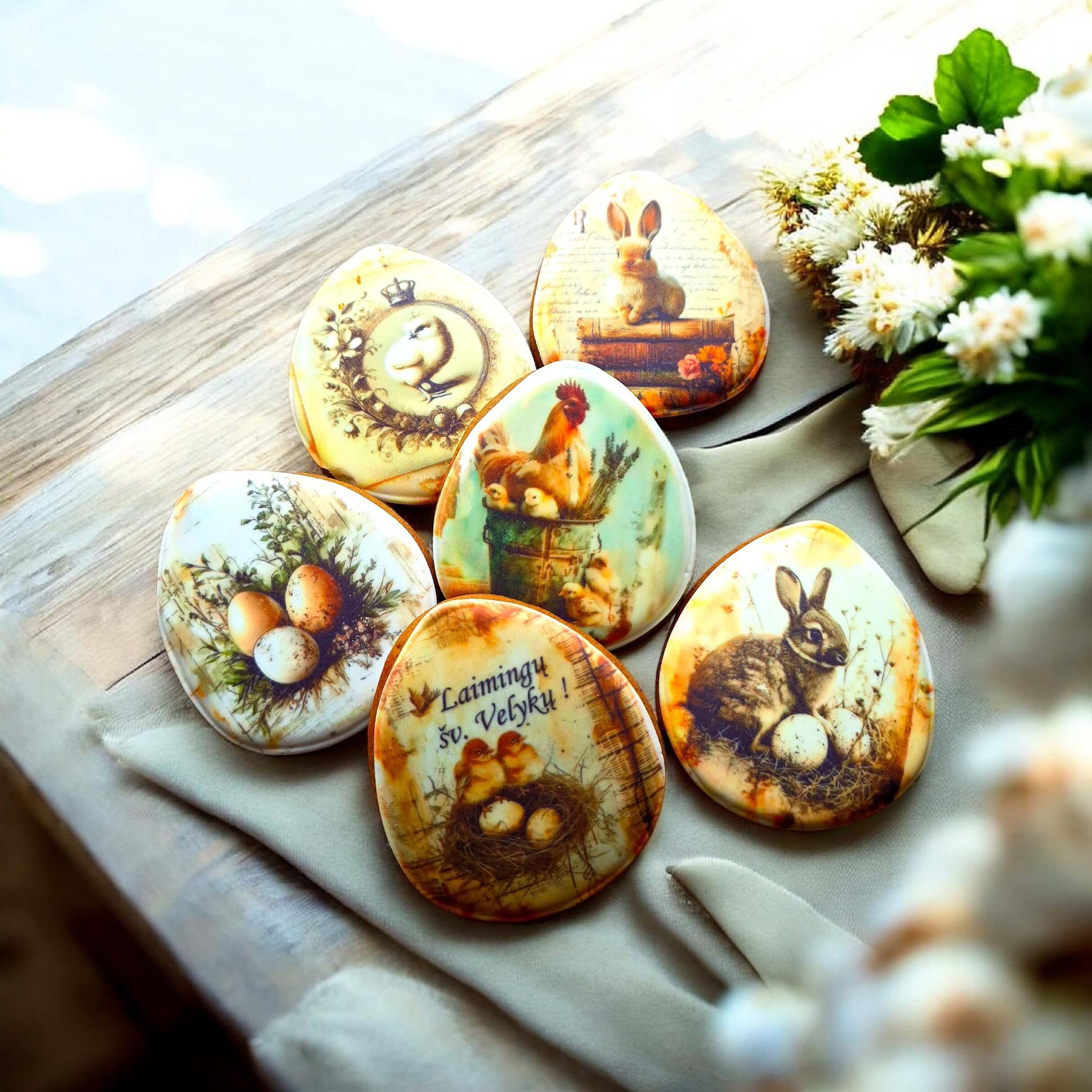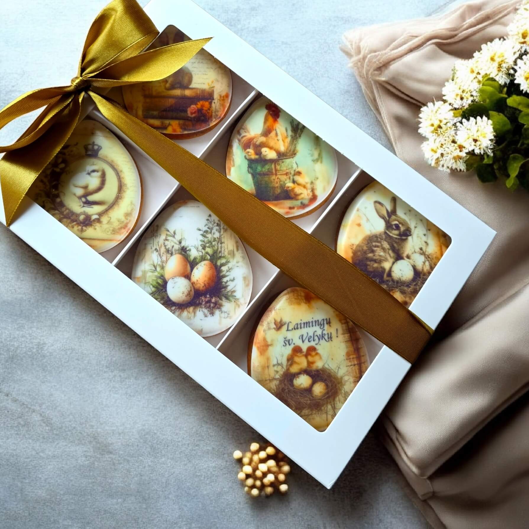 Rankų darbo Velykiniai meduoliai – vintažinio stiliaus rinkinys (6 vnt.) dovanų dėžutėje