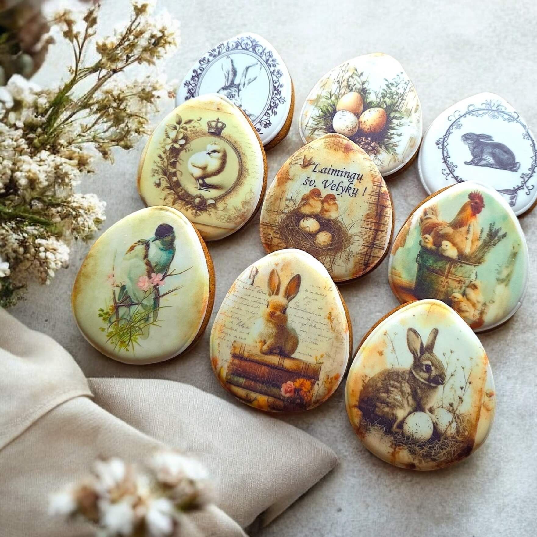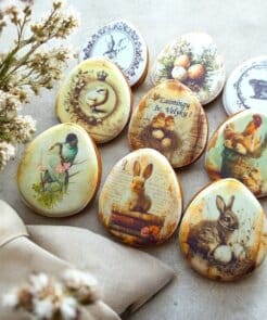 Švelnaus, romantiško vintažinio stiliaus Velykų meduolių rinkinys, sukurtas jaukiai ir estetiškai šventei. Kiekvienas meduolis dekoruotas kruopščiai, subtilių pastelinių atspalvių iliustracijomis su pavasario motyvais – zuikučiais, paukšteliais, lizdeliais ir Velykų simbolika.