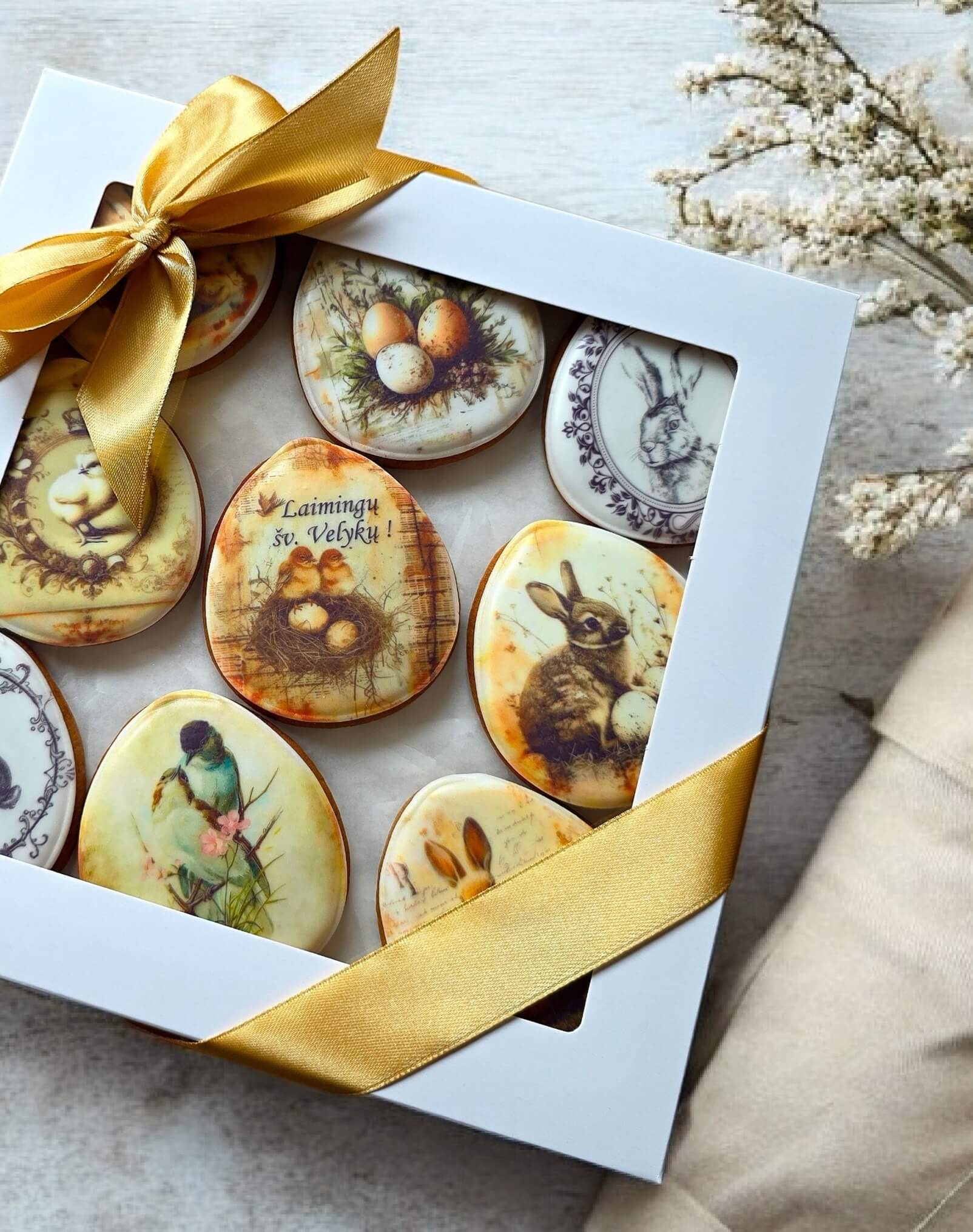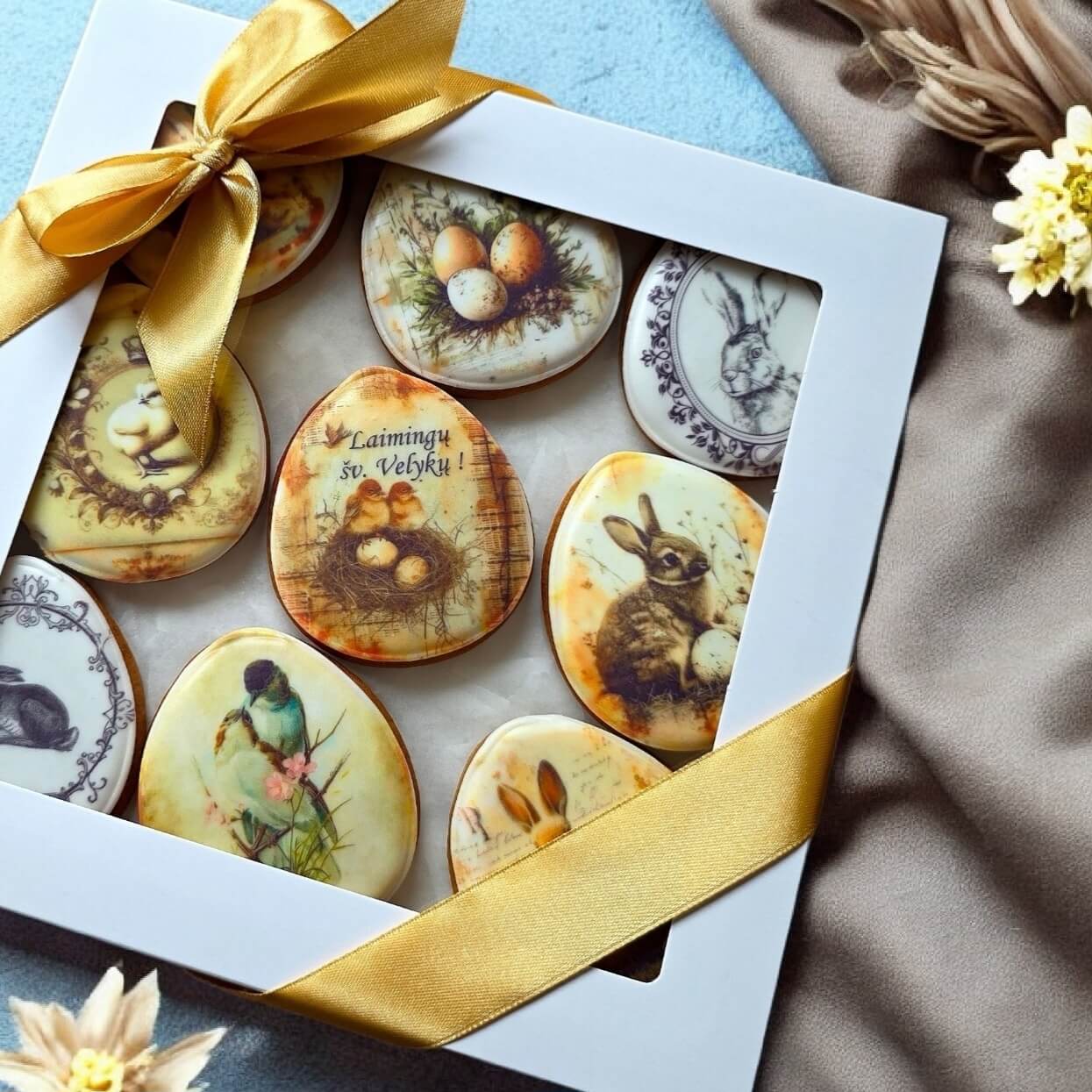 Rankų darbo Velykiniai meduoliai – vintažinio stiliaus rinkinys (9 vnt.) dovanų dėžutėje