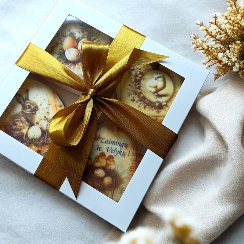 Elegantiškai supakuoti, paruošti dovanoti – dėžutės su kaspinais ar šventiniais akcentais.